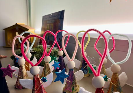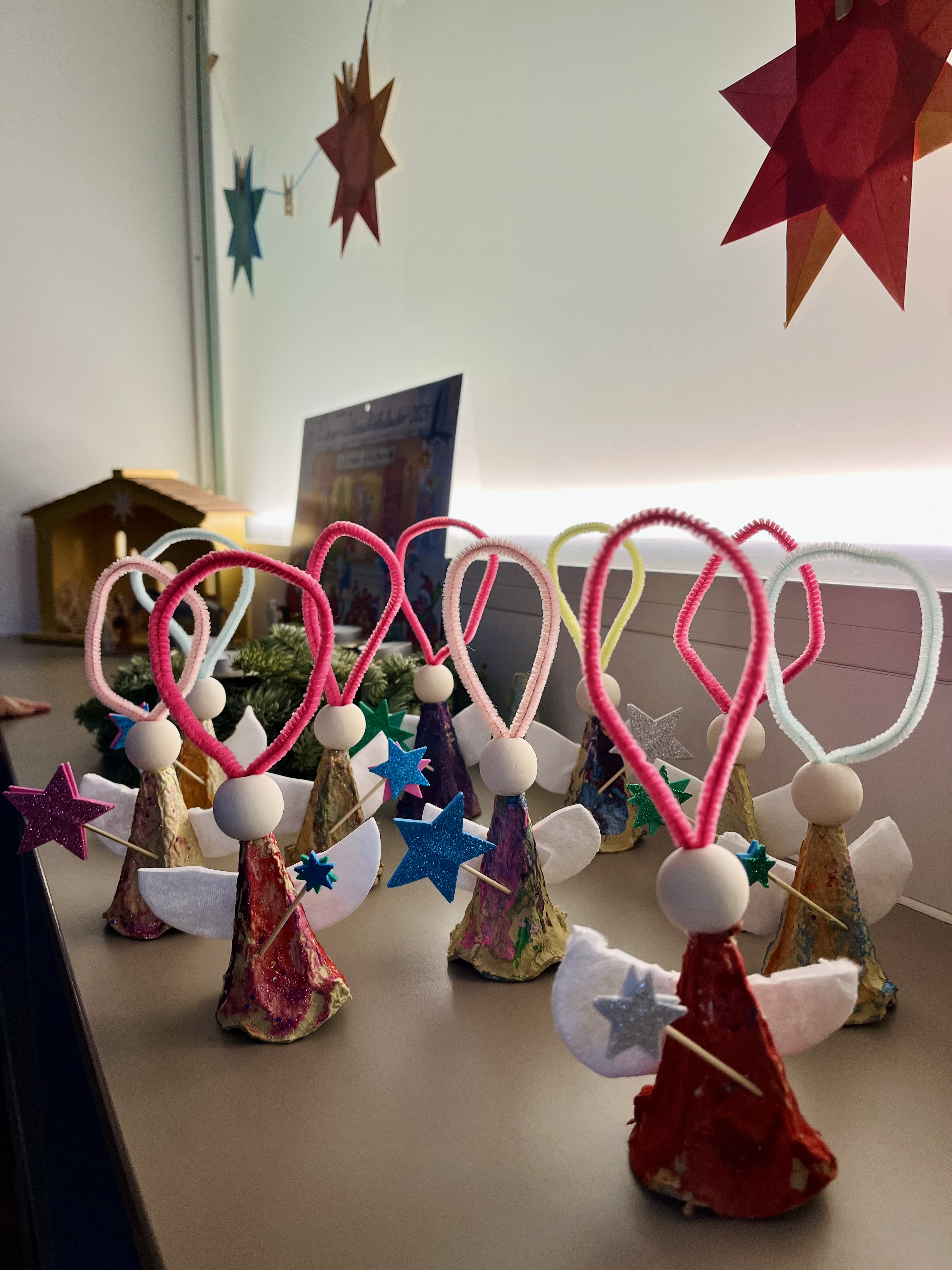 Weil in der Weihnachtsgeschichte ziemliche viele Engel vorkommen, haben die Delfine im Leuchtturm Engel gebastelt.